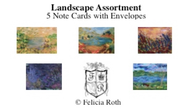 Copyrighted art 5 notecards 4 1/4” x 5 1/2” (packaged) White matte heavy weight card stock (blank inside), with envelopes “Glorious Tree” “Love’s Journey” “Garden Bliss” “Provence” “Sunset Garden” Click on picture to enlarge $20.00